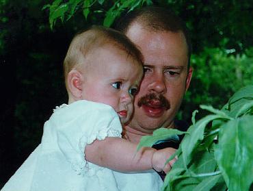 Uncle Matt took me around the yard showing me stuff. My pretty dress was hand made by Aunt Mimi. She is a very good seamstress. Dad says I have Uncle Matt's nose???