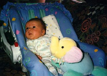 One of my favorite things to do early on was to look at ceiling fans. Mind you they were never on, but I was still fascinated by them. Dumbo is in my lap. I like him becuase he plays "It's a Small, Small World".