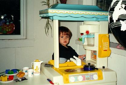 Playing on the front porch. This is the kitchen that my cousin Amanda gave me. I play with it a lot.