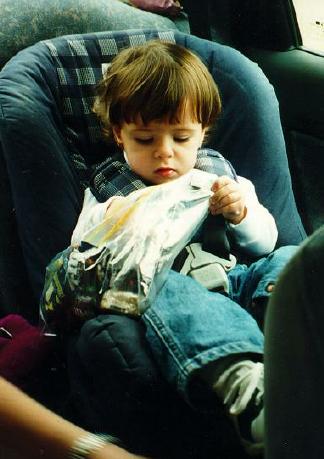 Searching the snak bag in the rental car.
